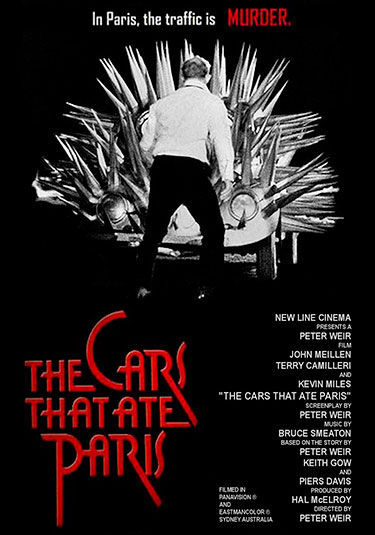 Título: Los Coches que Devoraron París (The Cars that ate Paris). Año: 1974. Duración: 90 min. País: Australia. Director: Peter Weir. Guión: Peter Weir, Keith Gow, Piers Davies. Música: Bruce Smeaton. Fotografía: John R.McLean. Reparto: John Meillon, Terry Camilleri, Kevin Miles, Rick Scully, Max Gillies, Danny Adcock, Bruce Spence, Kevin Golsby, Chris Haywood, Peter Armstrong.